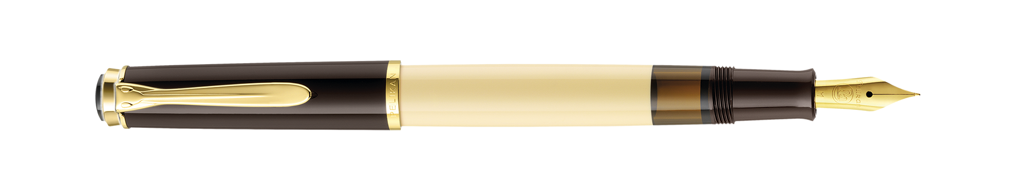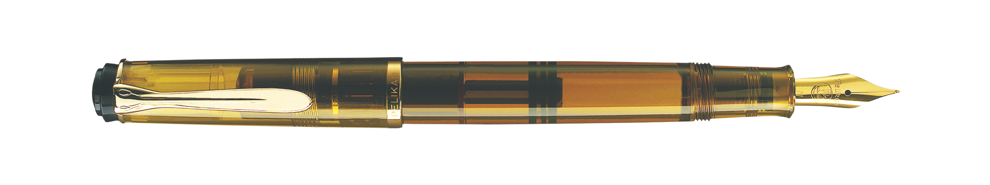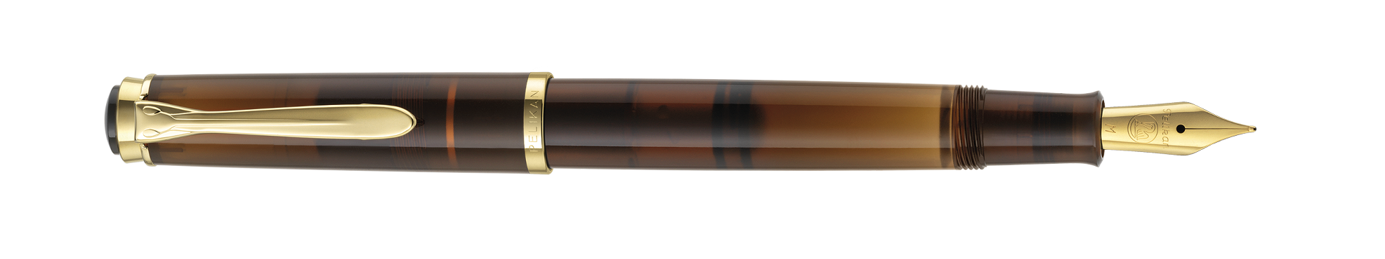 This piston fountain pen is made of high-quality resin in a fascinating cognac color, with gold-plated rings and the special gold-plated Pelikan clip. The nib is made of stainless steel and also gold-plated. It is available in five different sizes, including the very popular Italic nib.