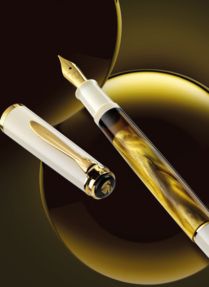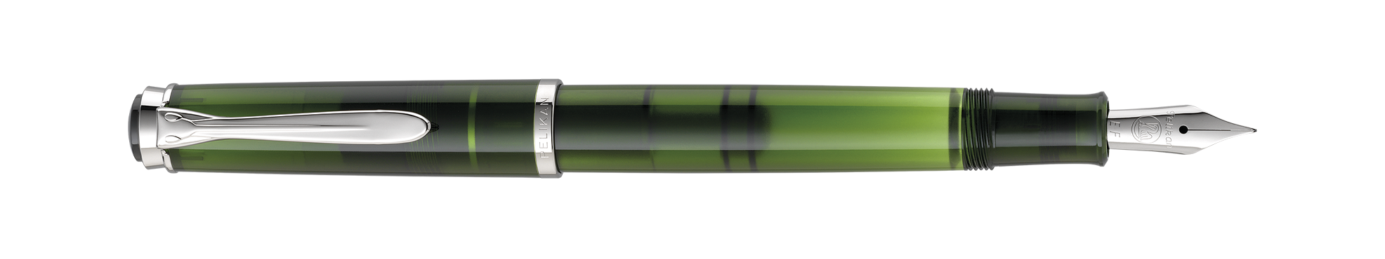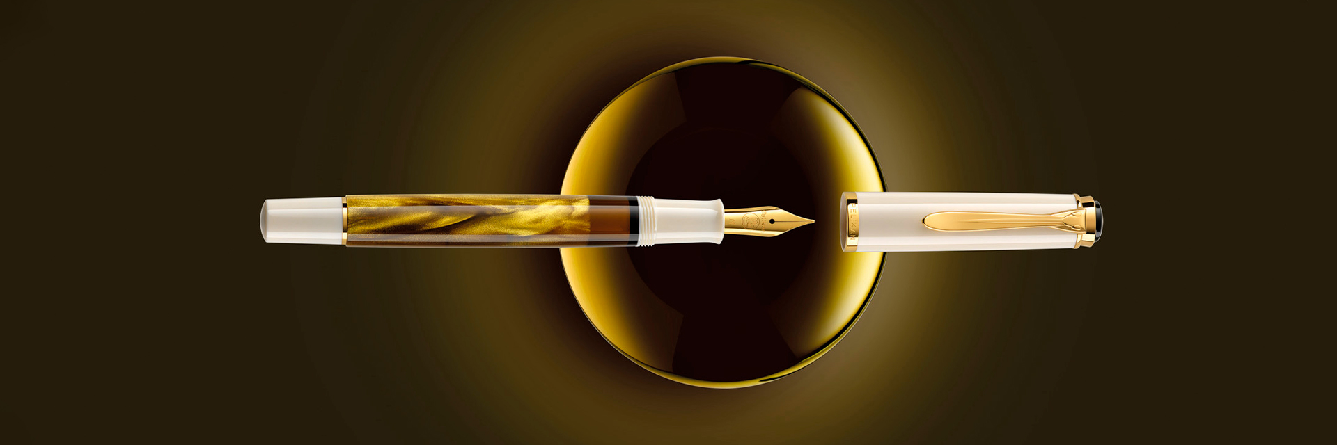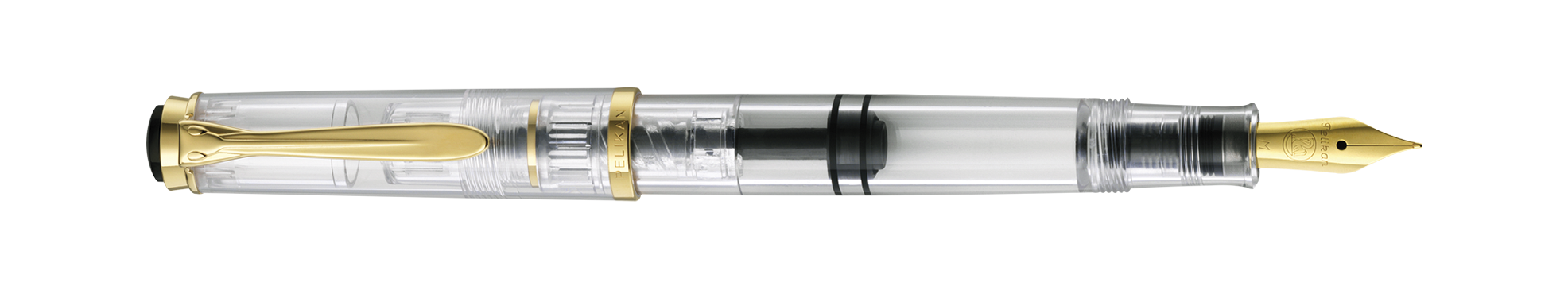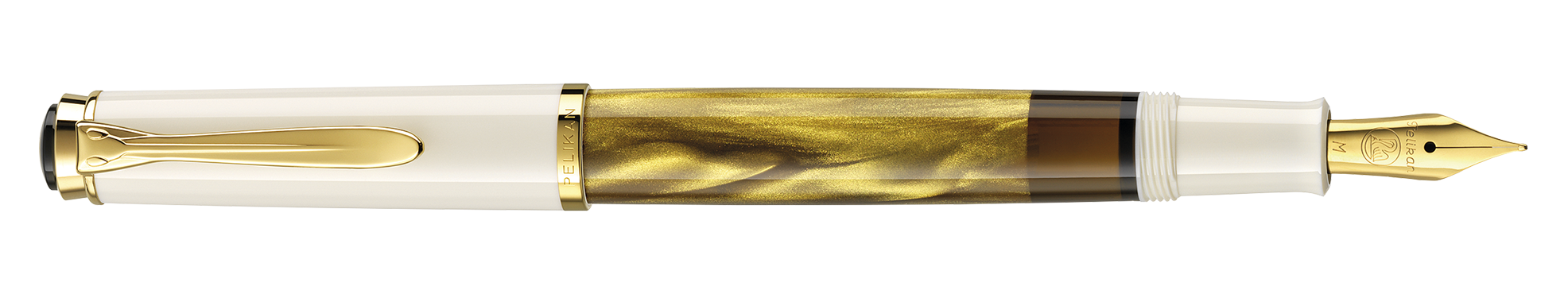 All rings and the typical Pelikan clip are plated with 24-carat gold. The fountain pen with piston mechanism is equipped with a gold-plated stainless-steel nib and will be available in 4 nib widths EF, F, M and B. The matching ballpoint pen has a push-button mechanism. Quality, made in Germany.