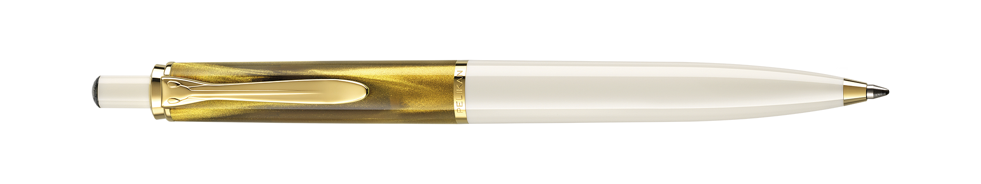 The combination of gold-marbled barrel material and white elements give a noble and graceful appearance to this fine writing instrument with a weight of 13,4 g and a size of 12,5 cm with closed cap.