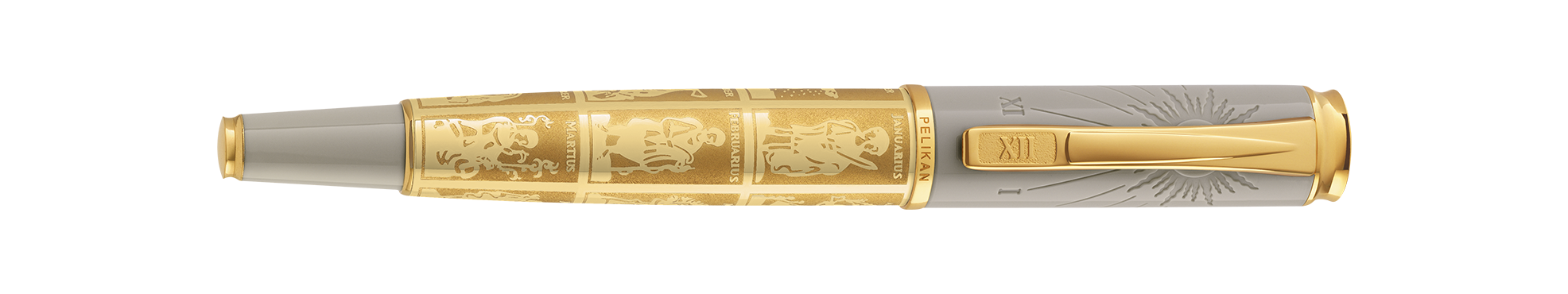 In ancient times, the Babylonians and Greeks used the position of the sun in the sky and created the first sundials. A vertical shadow stick, whose shadow fell on a clock face, served to measure time. Pelikan has engraved the structure of a sundial with eleven marked hours onto the cap of the fountain pen. The twelfth hour appears as an embossed high relief in the lower part of the clip, which at the same time adopts the symbolic function of the shadow stick.