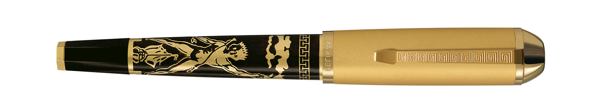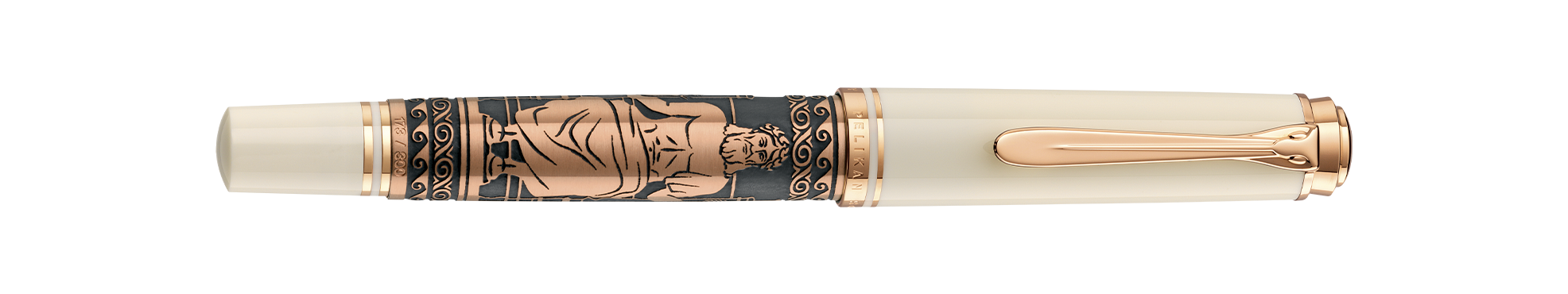 Pelikan has used valuable 18-carat rose gold for the embellishments. Using painstaking artistic processing, the motif of Zeus has been worked into the barrel in 925 Sterling silver, and finally all decorative elements plated with 18-carat gold in an electroplating bath. To finish, the motif and decorative elements had a clear varnish applied in order for the background to be colored with anthracite tones.