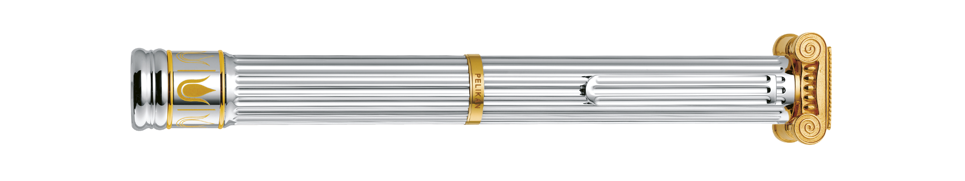 The exclusive fountain pen from Pelikan recalls this technical and artistic marvel with an equivalent degree of precision and craftsmanship. The pen is impressively displayed under a glass dome designed to be reminiscent of the original. The dark blue lacquered barrel enclosed between gold-plated edges and the gold-plated clip emphasize the preciousness of the pen. The front section is adorned with an engraved image of the ancient building.