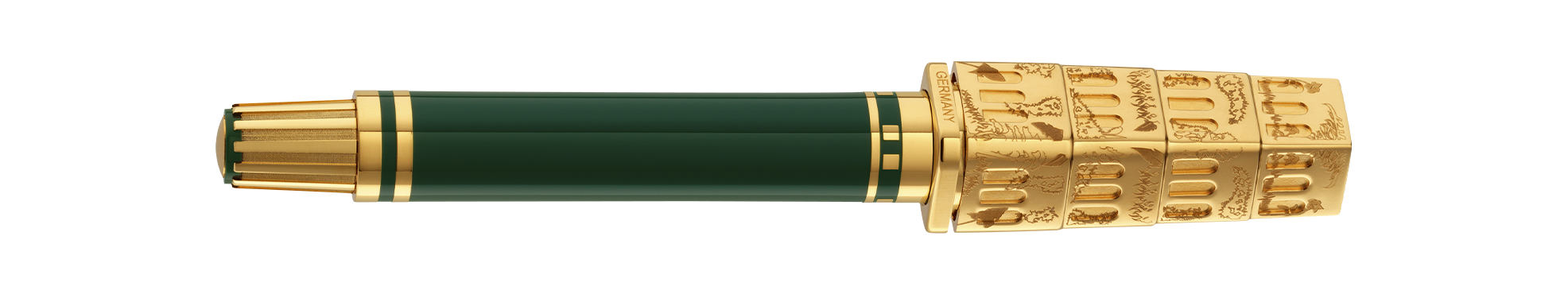 Each pen detail has been meticulously designed and crafted with to reflect and pay tribute to this magnificent achievement. The new Hanging Gardens writing instruments are intricate in detail, with a gold-plated cap which artistically depicts four stepped terraces. The dark green barrel is refined with lacquer and polished to a high gloss. Edged by gold-plated rings, it flows into the superbly crafted front part of the fountain pen.