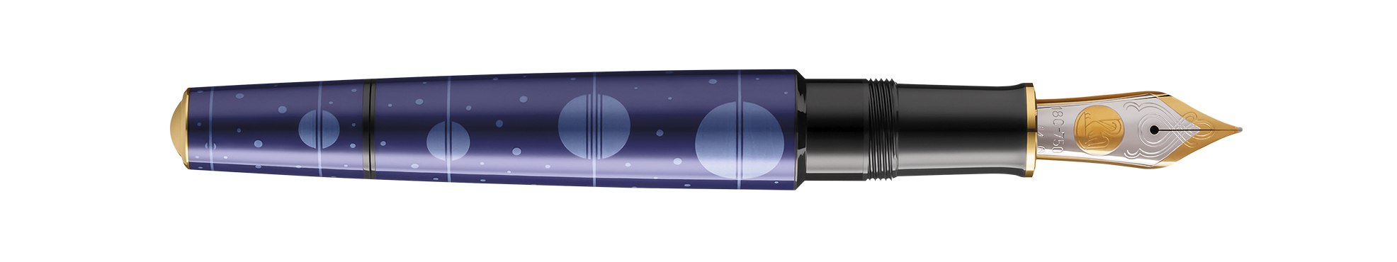 This exclusive fountain pen is made of sterling silver and is coated with cosmic blue varnish. The top of the cap symbolizes the golden sun shining over all things. At the lower end of the cap finally begins – also having used most elaborate engraving techniques – the fascinating depiction of all nine planets.