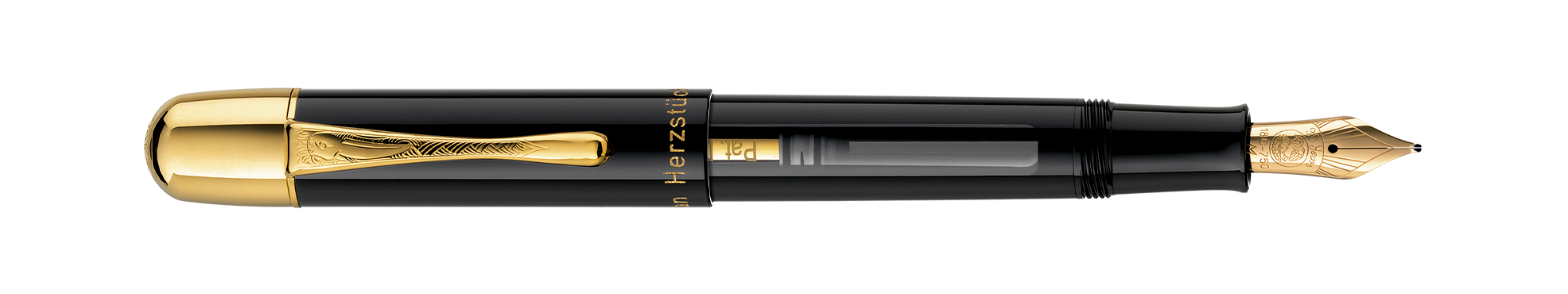 Kept entirely in black and gold, the pen appears particularly exclusive. Gilded brass and the 18-carat-gold nib ensure that the “Herzstück 1929” shines. The black high-grade resin – the so-called platinum of plastics – is polished with natural diamonds and exerts a self-polishing effect with use. Extreme gloss and the utmost surface hardness characterize the material.