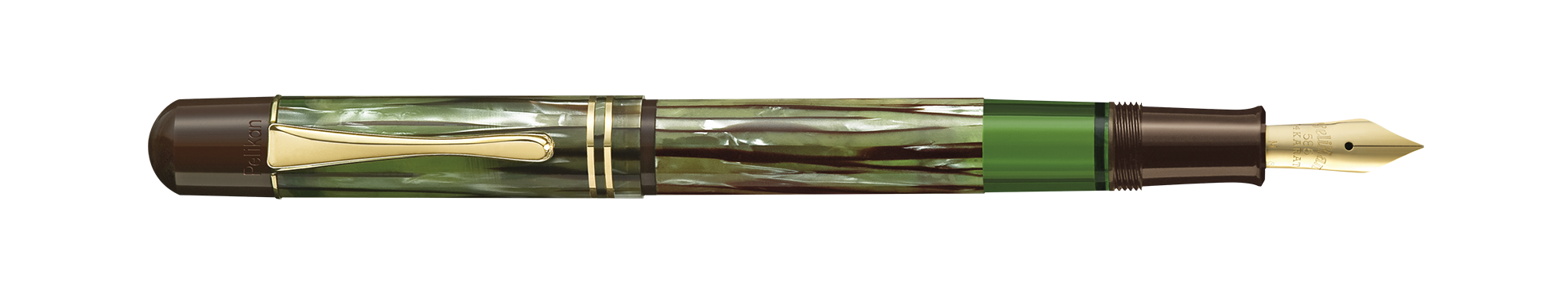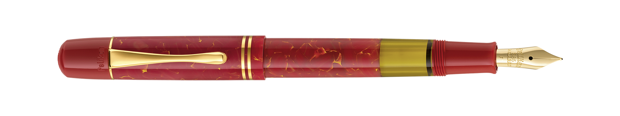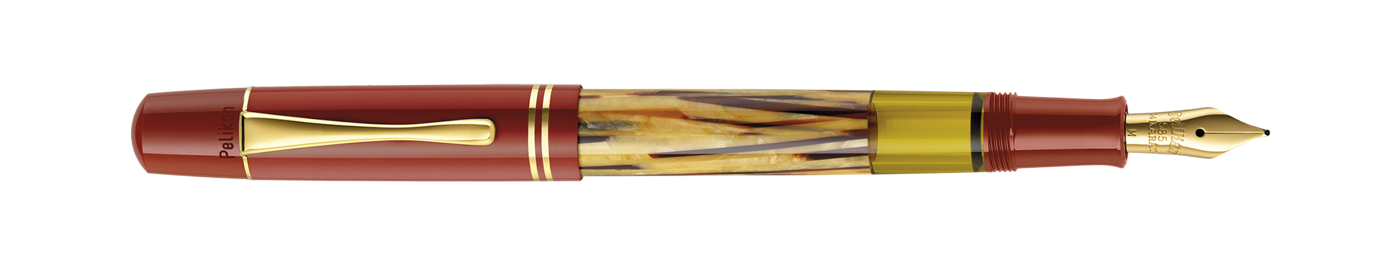 The barrel is made of the typical Pelikan cellulose acetate in a very unique pattern. Connoisseurs know that the production of this decorative core of the fountain pen is extremely work-intensive. The dark-red parts are made of high-quality resin that polishes itself time and again during use. You can choose the 14 carat gold nib in four sizes: EF, F, M, and B.