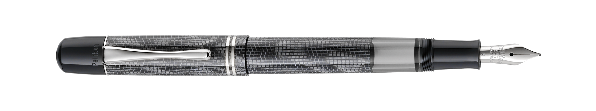 The patterned barrel and the cap of this fountain pen are made of cellulose acetate with a completely smooth surface. High quality resin was used for the black pieces, and the Pelikan logo is engraved in the traditional manner at the top of the cap. The precious metal palladium covers the clip and rings, and the 14 carat gold nib was completely rhodinized to obtain a corresponding silver effect. For this Special Edition, the packaging was adapted so that it fits to the lizard design on the fountain pen. This much awaited fountain pen was available in a limited quantity starting December 2012, just in time for Pelikan‘s 175th anniversary in 2013.