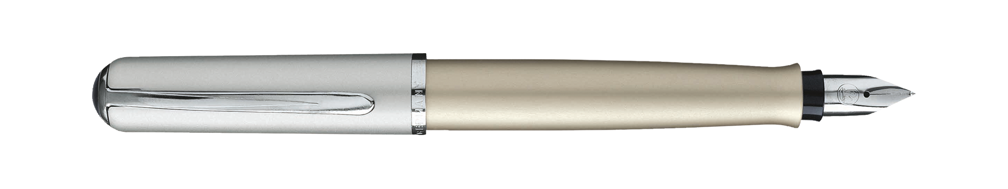 The fountain pen Epoch 360 titan-silver works with a composition of materials playfully: a titan-colored barrel made of anodized aluminum is combined with a silver varnished cap made of high-quality resin. The frosted surface of both components provides the Epoch with its sophisticated elegance. The silver-shining cap, the clip in the form of a Pelikan beak and the decorative rings offer a gentle accent.